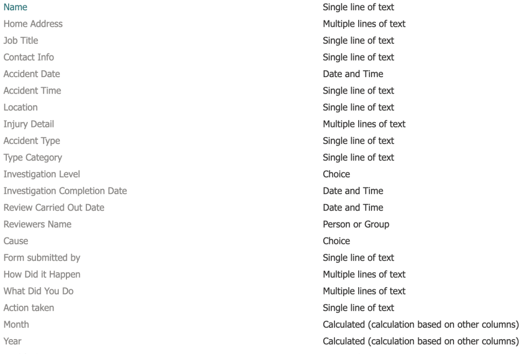 Now create a list called ‘Accident Reports’ and add a column for each field of data you want to collect. Below is a list of columns that I have used.